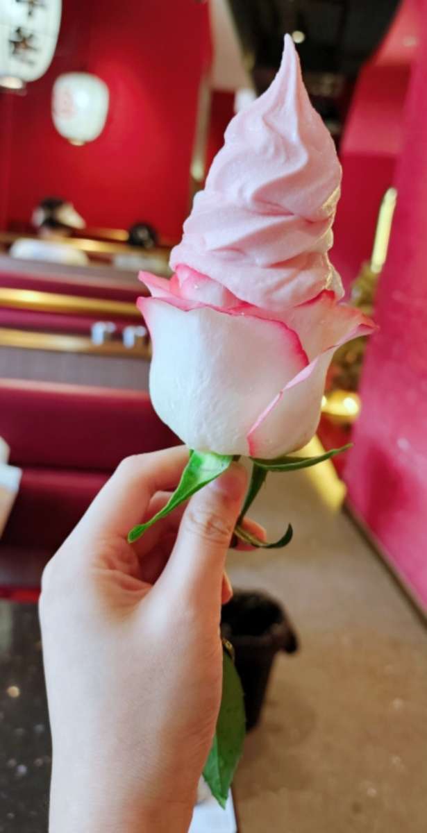 玫瑰冰激凌,下面是真的玫瑰花,还挺新奇的。我在拿到这个冰激凌之前一直有些疑惑,那冰激凌是有一定重量的玫瑰花会不会托不住啊,没想到还真的托住了,好神奇。冰激凌本身比较像没加奶油的那种冰坨子不算很好吃,但是外形好看,OK,你过关!