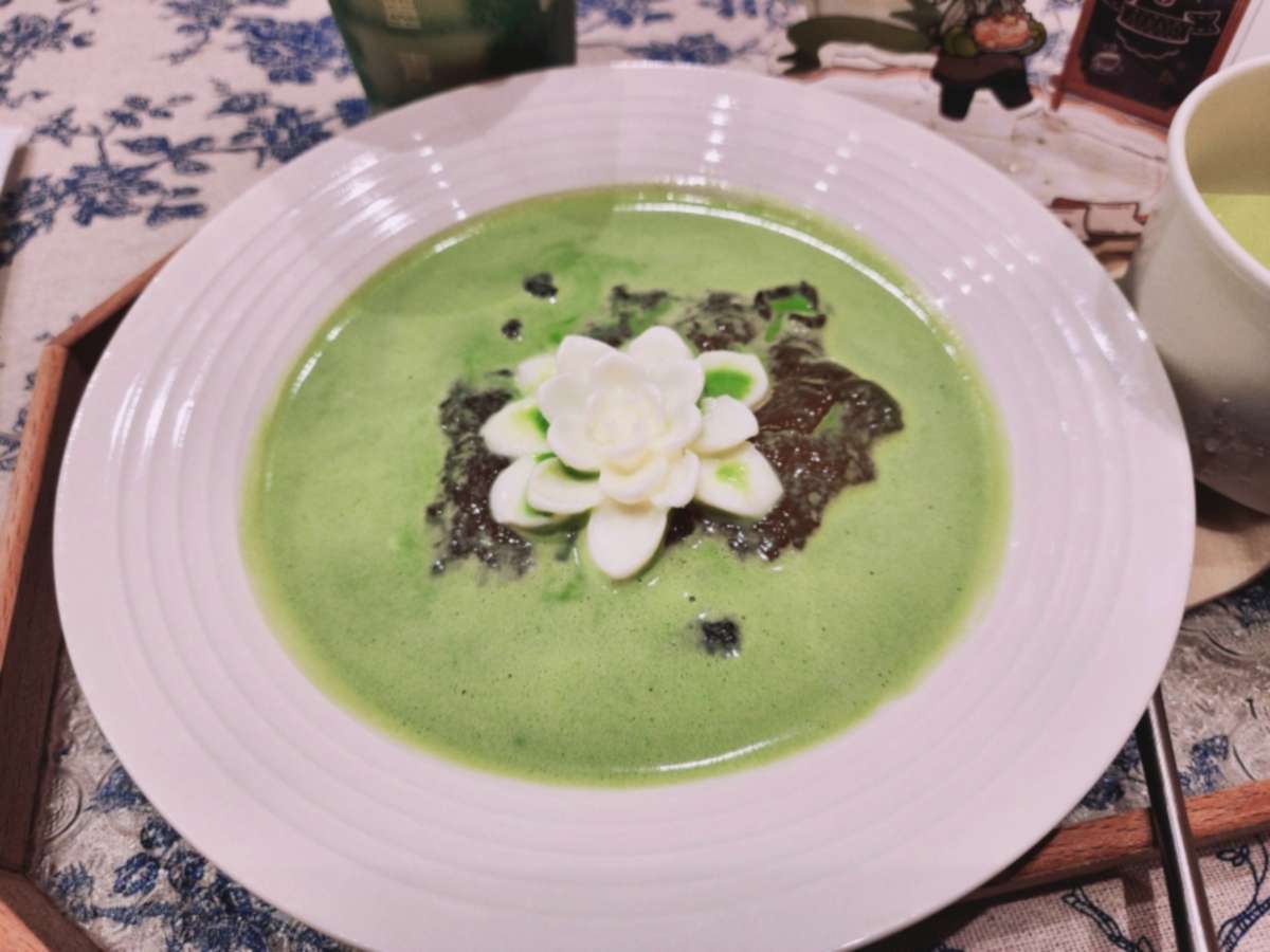 抹茶开花上面白色的花是冰激凌,然后下面那个看着像是黑色的底其实是藕粉做成的类似于凉皮儿一样的东西,说实话我还是第一次吃这种凝胶状的藕粉。吃起来没什么味道,或者说味道很淡。白色的冰激凌花拍照来不及的话就化了,抹茶没法和藕粉融合的很好,总体是好看>好吃的程度吧。
