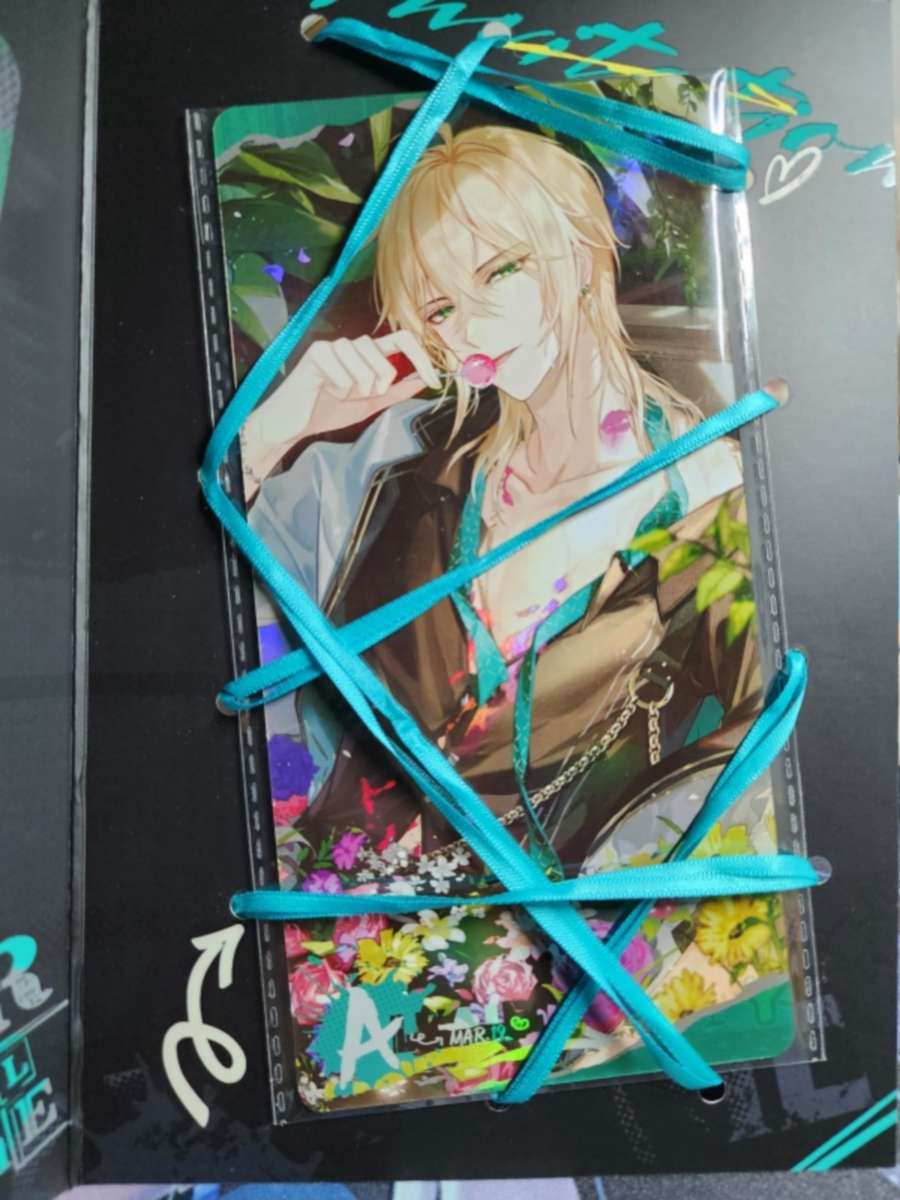 看完了今年的情人节相关再来看看去年520的柄图,本来这套图是给奶茶店做联动的结果联动不了了之之后自己出了,感觉还是自己出会更好些?这个镭射票也做了很有意思的处理,给外壳增加了几个孔和两根丝带各种捆绑,结果我根本不会绑这玩意儿搞了个鞋带的系法,外壳也做了一个手机屏幕的设计。你别说,其实我更喜欢带着外壳的整体效果,单拿出来虽然这个卡面我很喜欢但多少有点单调。