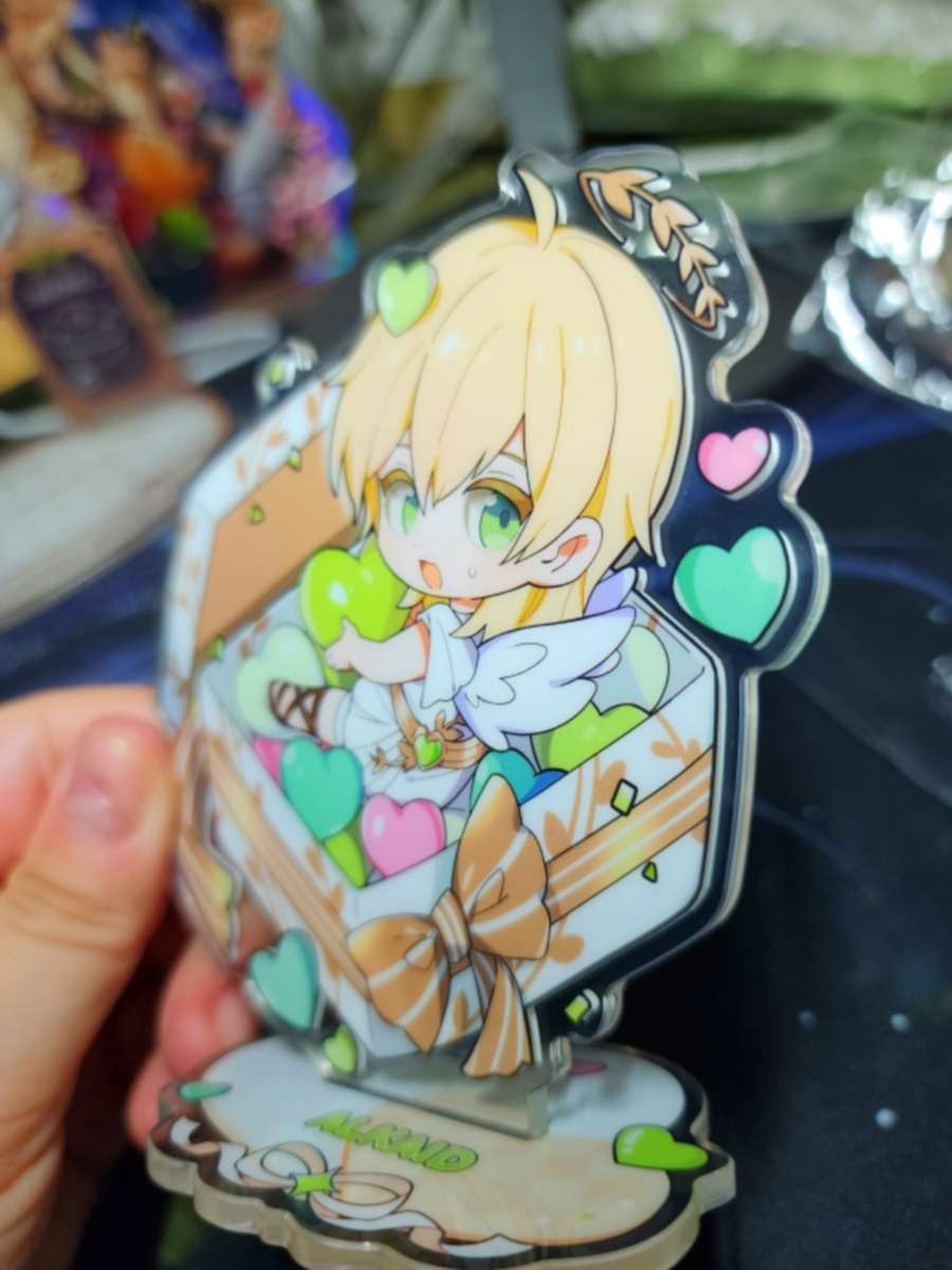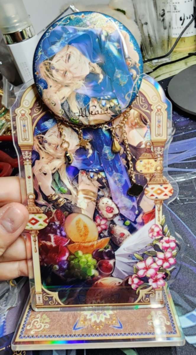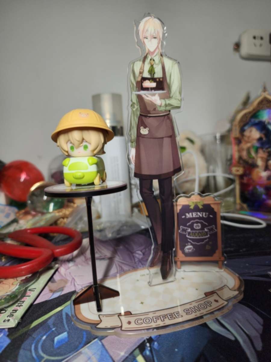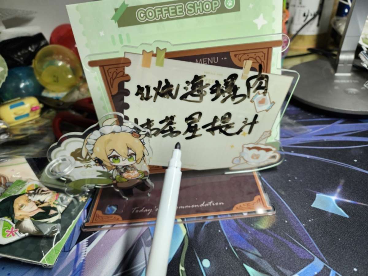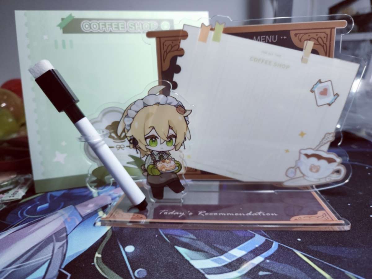 说是趣味性是因为也不是单卖一个立牌,Q版的做了个可擦写的算是小白板吧,然后正比的立牌则是做了个立体小桌子,还真的能放点东西真是笑死我了,不过我觉得最有意思的应该是我无意间发现了这俩立牌的插口是同一个尺寸然后这俩能互换底座插,笑死了)导致我前几天就带着正比的底座和Q版的人物出去吃甜ฅ(*`ω´*)ฅ