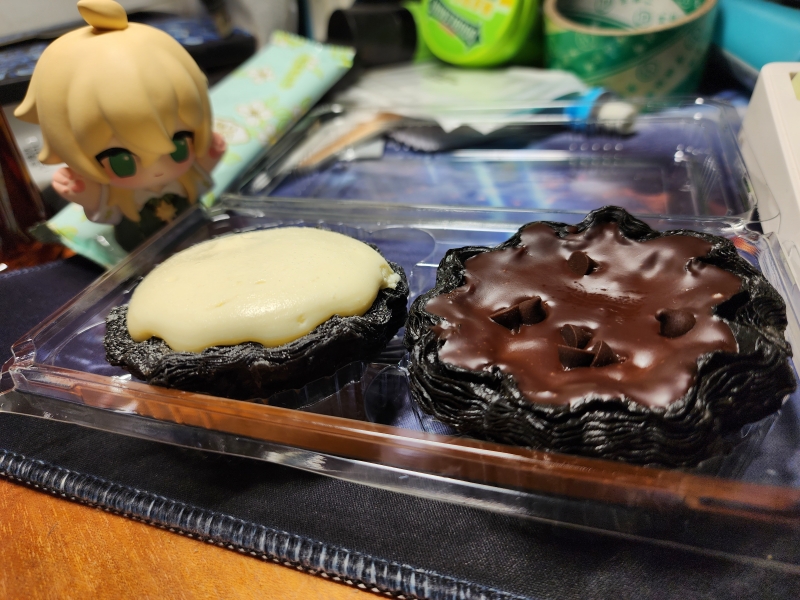 六贤记的蛋挞,其实还有个玫瑰花口味儿的,那个太难吃了,只适合拍照吃过一次就没再买了。这次的两个是我觉得最近做的不错的,巧克力和糯米浓浆?白色的那个第一次吃非常惊艳,上面的糯米浓浆很好吃,下面是芋泥夹层,巧克力就是单纯的巧克力了。当时买的时候我找店员姐姐推荐,她说她更喜欢糯米这款口味比较淡,巧克力的吃多了比较腻。但是我第二次买的时候觉得糯米的就第一次吃非常惊艳之后就趋于一种平静,反而巧克力这款属于低开高走,回甘味道很棒o( ̄▽ ̄)d