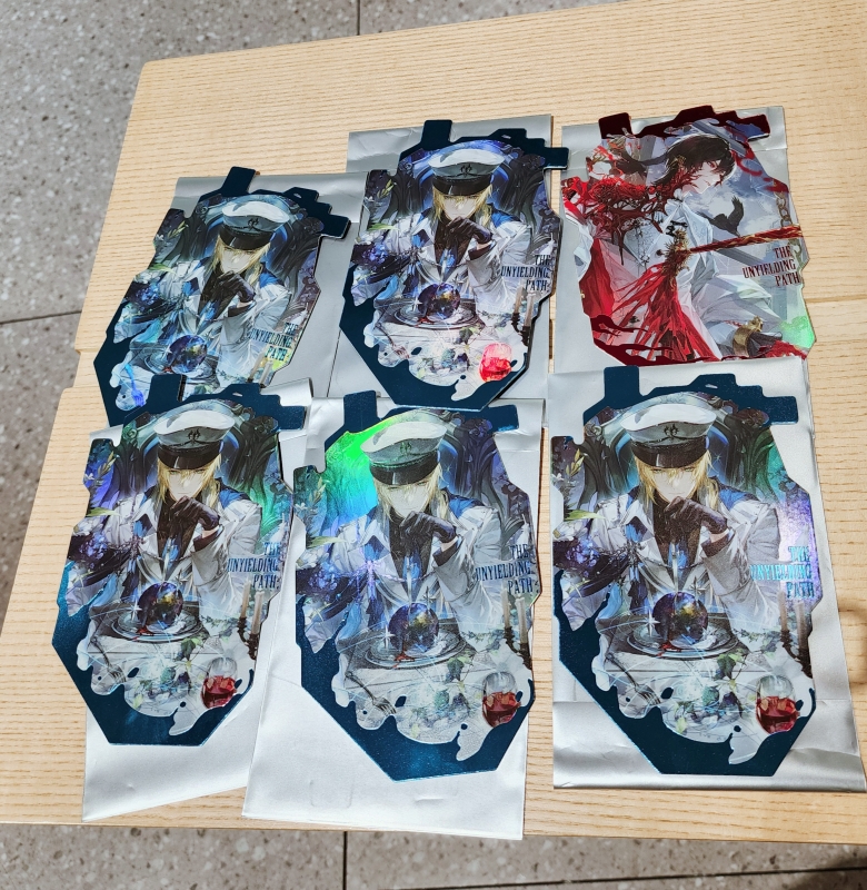 因为第一天打卡大失败所以第二天我们又去了,这一次虽然手气也不算很好,好在在打卡点遇到了同好要换所以就给换了。我记得第一个打卡点是我俩都出了叶瑄,和别人换了星提,第二个打卡点我又出了牧首,第三个打卡点我终于是摸到了星提♪(^∇^*)(这一次我又是三个不重复呢)说起来最后摸到的星提还有点命中注定的意思,当时看到泉咪和另一个小伙伴抽,后面我就想要不就拿第一张要不就拿最后一张吧,结果我拿了最后一张也就是最外层那个,半开的时候看到蓝色海惊了一下(因为执政官也是蓝色)后面一抽是先生!