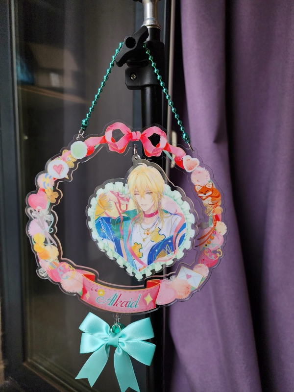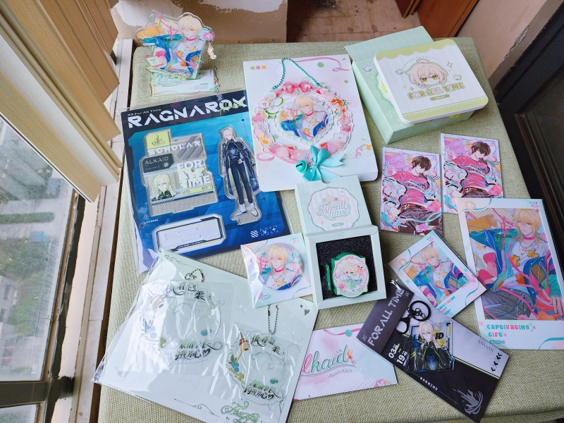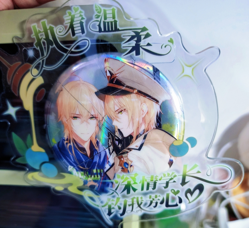 无边色纸要我说其实就是……硬纸板囧但是做了一点点浮雕工艺,加上摸起来哑光就确实会比亚克力的好摸一点。不过我感觉做亚克力色纸有个原因是亚克力会比这种纸张校色更准吧,突然开始期待蔓生虚像的亚克力色纸了。其他的普通制品就不一一拍了,这次比较让我高兴的是补了学者的立牌和挂件,这俩玩意儿当时闲鱼可是收都收不到啊……